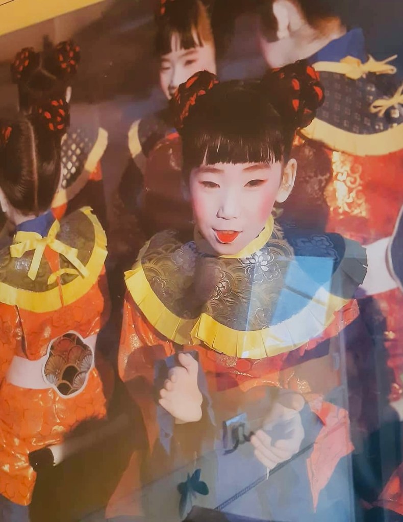 Les petites filles sont toutes habillées de la même façon : un kimono en soie d’un rouge écarlate, bordé, autour du cou, d’une large bande scintillante couleur vieil or. Au creux du dos, elles portent un emblème noir couvert de fines dorures. Des nœuds papillons, d’un bleu foncé moucheté de points rouges, retiennent leurs nattes enroulées au-dessus de leur tête.