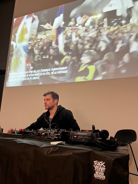 La nocturne « La fête est politique » a rassemblé un large public autour d’une soirée mêlant performance, DJ sets, fresque participative et réflexion sur les cultures underground. L’association a également diffusé des vidéos de manifestations en Serbie, enrichissant la réflexion sur le rôle social et politique de la fête. « En Serbie, depuis plus d’un an, les étudiants transforment la rue en un espace de résistance et de fête, où la politique reste un acte collectif de liberté. »